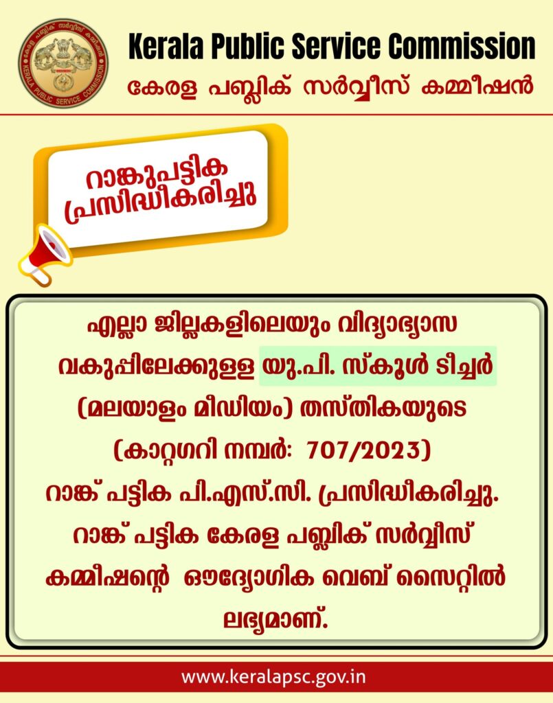 Rank List UP School Teacher Kerala PSC: The following is the list of candidates for selection to the post of U P SCHOOL TEACHER (MALAYALAM MEDIUM) (Cat. No. 707/2023) on Rs.35,600-75,400/- in EDUCATION DEPARTMENT IN MALAPPURAM DISTRICT, interviewed and found suitable by the Commission and arranged in the order of merit. This Ranked List is brought into force with effect from 10.10.2025.